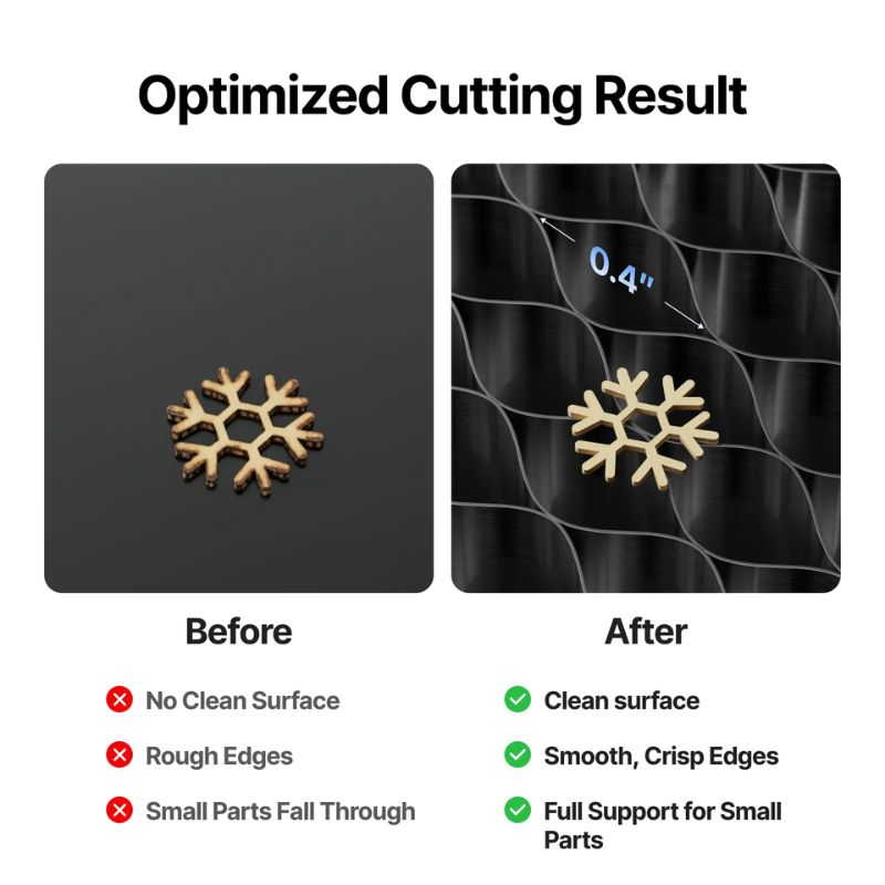 Grâce à sa conception en nid d’abeilles, l’air circule librement sous la pièce, ce qui limite l’accumulation de chaleur et réduit significativement les traces de brûlure ou de carbonisation sur la face inférieure des découpes. Ce point est particulièrement important lors de la découpe du bois, du contreplaqué, du cuir ou de certains plastiques.