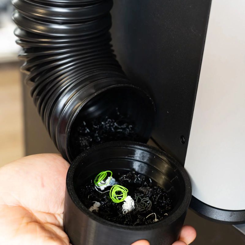 Les résidus de filament sont efficacement récupérés dans le conduit d’air flexible intégré au kit. Pour procéder au nettoyage et retirer l’ensemble des déchets accumulés, il suffit de dévisser simplement le tuyau. Cette conception pratique facilite l’entretien régulier, tout en maintenant un environnement de travail propre et sécurisé lors de vos impressions 3D avec les imprimantes Bambu Lab H2.