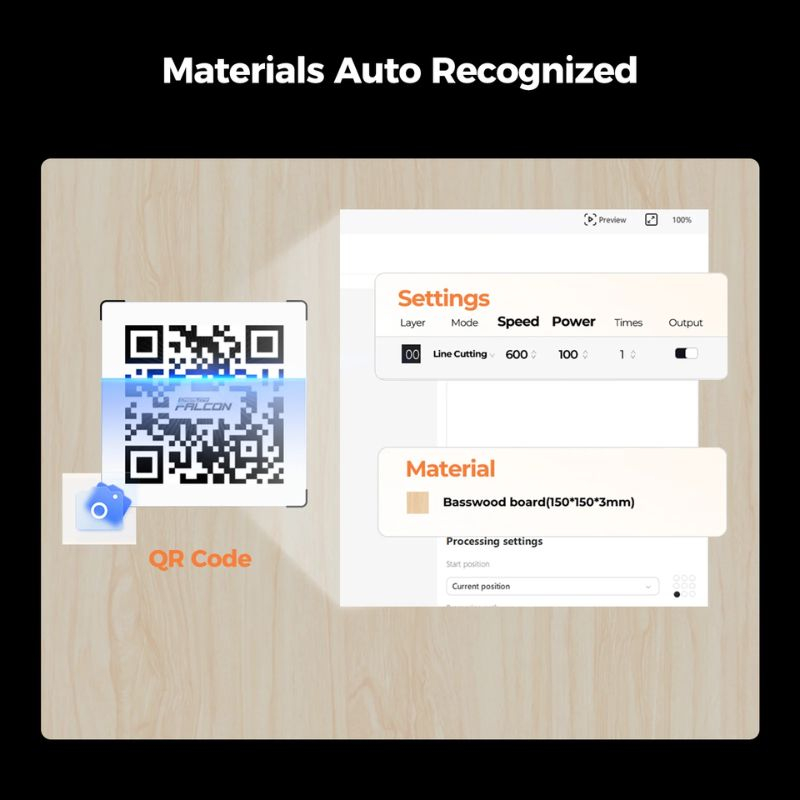 Le Falcon A1 détecte automatiquement le matériau via un QR code intégré, optimisant les paramètres de gravure et découpe sans réglages manuels.