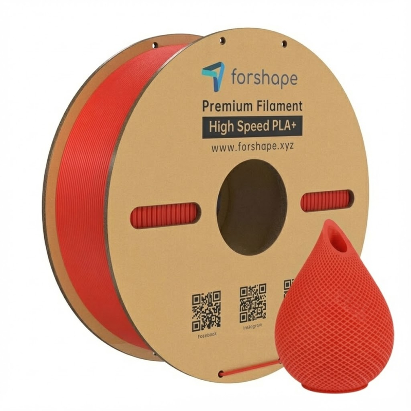 Le filament High-Speed PLA+ Forshape Rouge (PLA haute vitesse) permet des impressions à une vitesse pouvant atteindre 600 mm/s grâce à sa formulation unique combinant haute fluidité et refroidissement rapide.