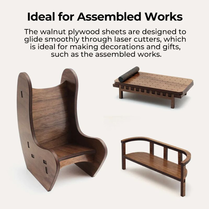 Le lot de 10 plaques de contreplaqué noyer (Walnut) 30x30x0,3cm est particulièrement adapté à la gravure et découpe laser. Plus dense que le tilleul, il offre un rendu visuel plus marqué avec un contraste naturel élégant. Sa surface régulière permet des découpes propres et des gravures détaillées, idéal pour objets décoratifs, signalétique ou créations personnalisées.