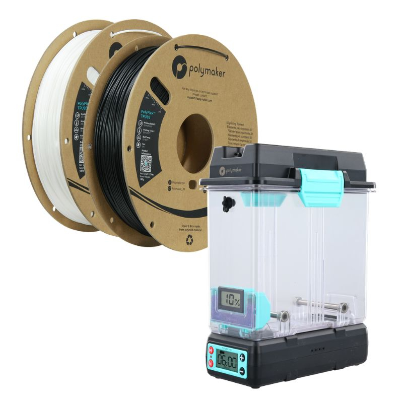 Ce pack complet signé Polymaker associe deux filaments PolyFlex TPU95 Noir et PolyFlex TPU95 Blanc à un PolyDryer Polymaker, pour garantir des impressions 3D flexibles fiables et performantes.
