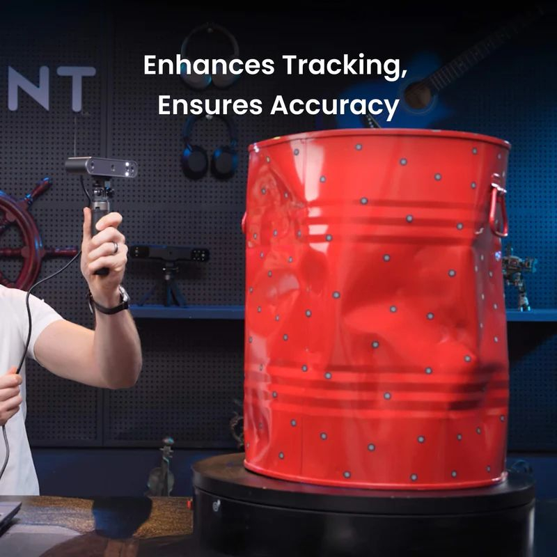 Flexible et adhésif, ce ruban peut être appliqué sur différentes surfaces, même courbes ou irrégulières, tout en restant stable pendant la numérisation. Les marqueurs réfléchissants garantissent une détection fiable, même dans des conditions de luminosité variables, assurant des résultats cohérents et précis.