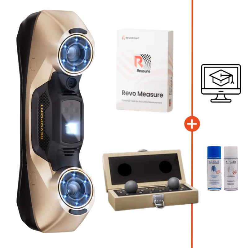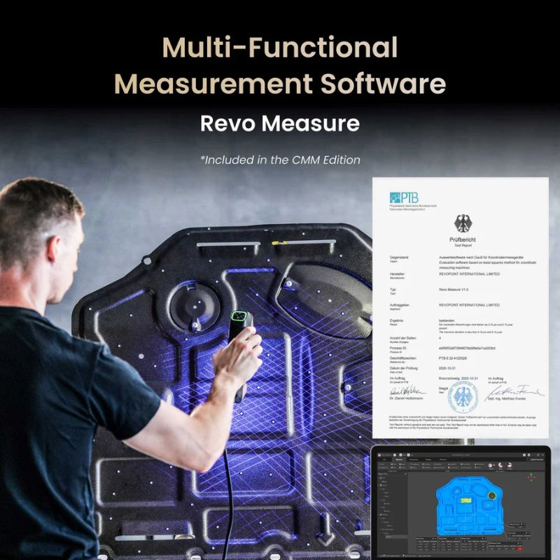 Cette édition CMM intègre en plus un workflow de contrôle métrologique avancé avec la Ball Plate certifiée CMM et le logiciel Revo Measure, permettant de transformer directement les scans en mesures 3D vérifiables et exploitables en contrôle qualité.