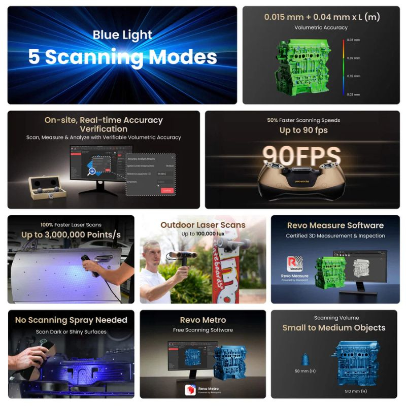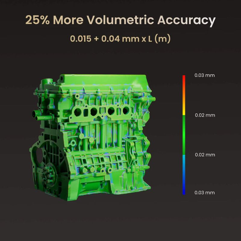 Le Revopoint MetroY Ultra CMM Edition est une solution de métrologie 3D conçue pour la précision, la vitesse et la vérification dimensionnelle en temps réel. Grâce à sa combinaison de laser multi-lignes et de lumière structurée plein champ, il s’adapte aussi bien aux surfaces complexes qu’aux pièces techniques exigeantes. Capable d’atteindre jusqu’à 3 000 000 points/s et 90 fps, il réduit drastiquement les temps de capture tout en conservant une exactitude volumétrique élevée.