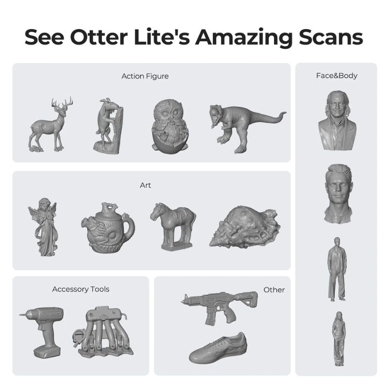 L’Otter Lite Basic conserve le système de quatre lentilles double focales, garantissant des scans précis et détaillés. Les petits objets bénéficient d’une grande finesse, tandis que les grands modèles sont capturés de manière homogène, avec reproduction fidèle des textures et des contours.