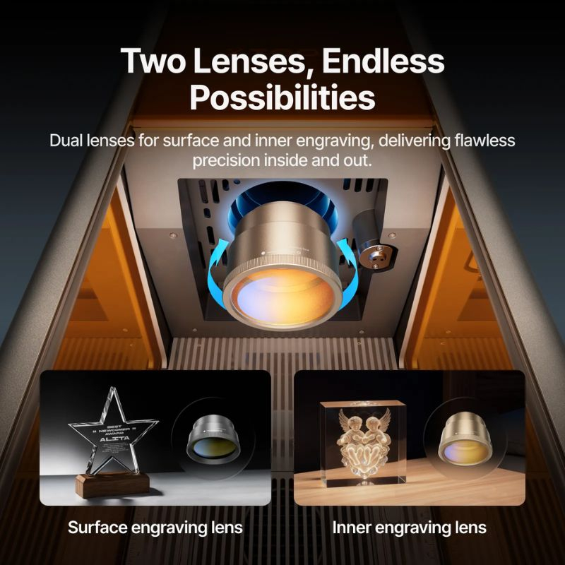 Pour les gravures internes dans le verre ou d’autres matériaux sensibles, une zone de 70 × 70 mm est dédiée, avec des lentilles interchangeables permettant de passer facilement entre gravure de surface et gravure interne.