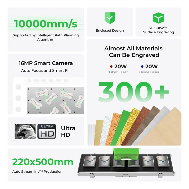 Le xTool F1 Ultra + Convoyeur est une solution de gravure et découpe laser complète pour les ateliers et lignes de production modernes. Cette machine combine puissance, précision et automatisation, permettant de travailler sur des matériaux variés tels que le métal, le bois, l’acrylique ou le cuir.
